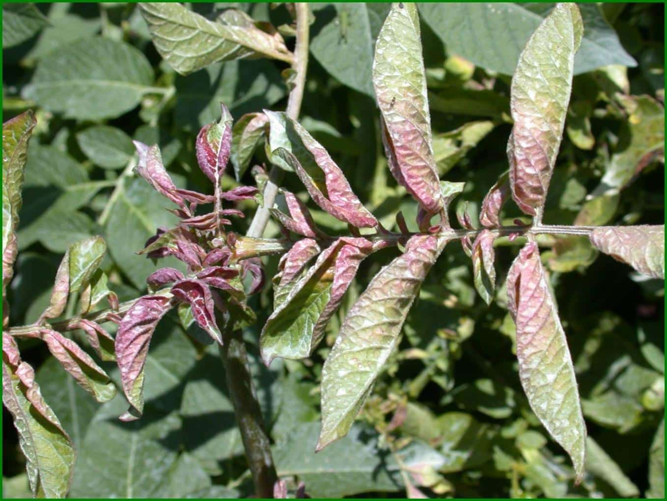 Where zebra chip is present, infected potato plants exhibit a range of foliar symptoms that resemble those caused by Potato Purple Top or “Punta Morada” (in Spanish), another economically important disease of potato, particularly in Mexico. Potato purple top is caused by phytoplasmas, transmitted by leafhoppers. Unlike zebra chip, purple top does not cause internal defects in potato tubers. However, in Mexico, the names of Zebra Chip and Potato Purple Top are used interchangeably, because of the similarities in above-ground plant symptoms, often leading to inappropriate and ineffective management strategies. Clearly, correct identification of the pathogens and their insect vectors is crucial, so that effective management strategies may be employed.