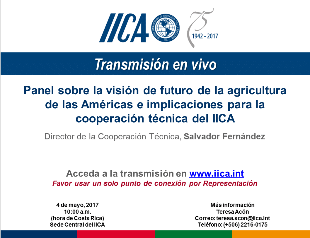 Durante la sesión plenaria de cierre de la II Reunión de los Comités Técnicos de los Proyectos Insignia y Sanidad Agropecuaria e Inocuidad de los Alimentos, se realizará el «Panel sobre la visión de futuro de la agricultura de las Américas e implicaciones para la cooperación técnica del IICA».