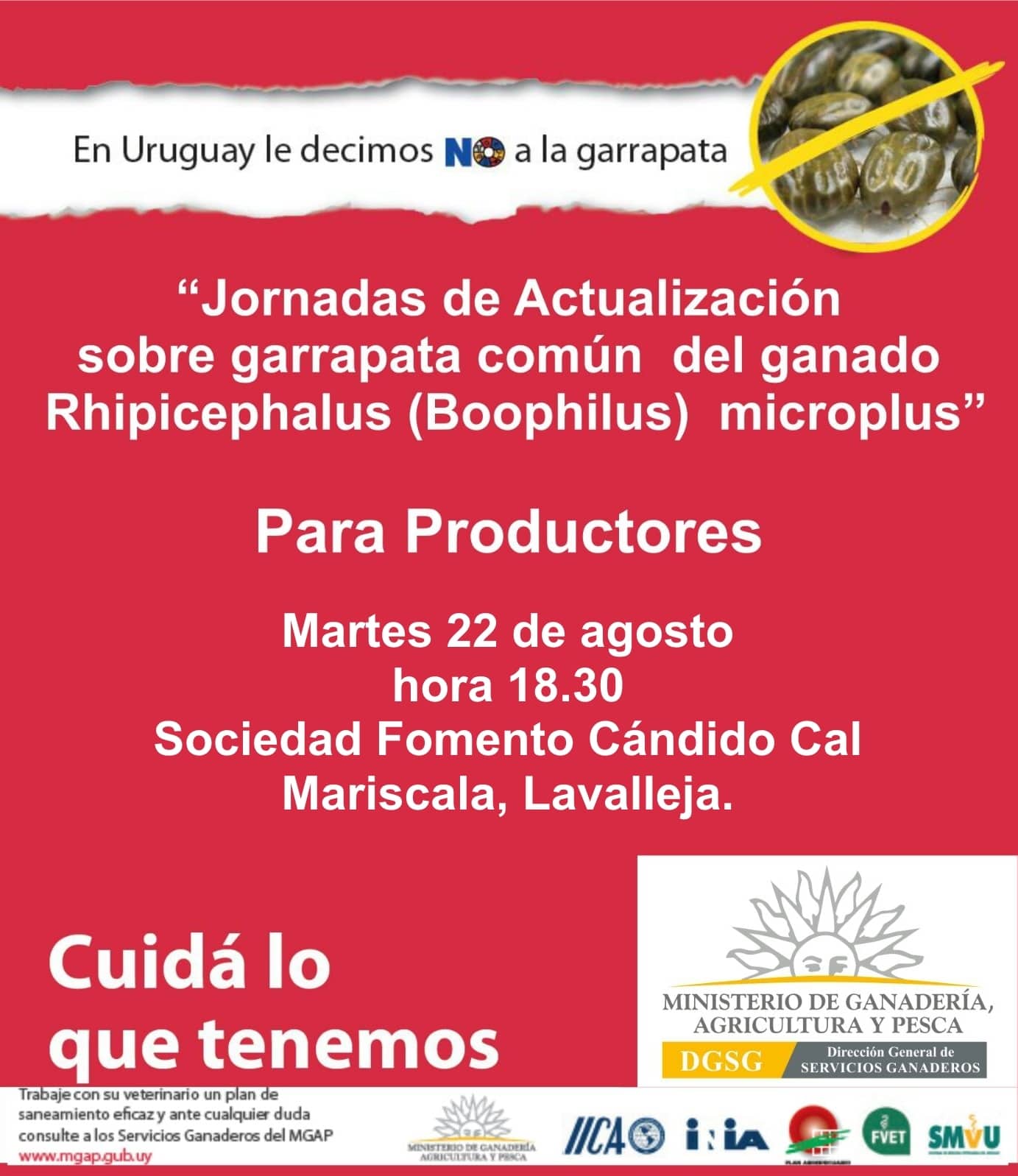La próxima jornada de actualización sobre garrapata común de ganado para productores será este martes 22, a las 18y30 horas. La actividad se desarrollará en la Sociedad de Fomento Cándido Cal Mariscala, Lavalleja.
