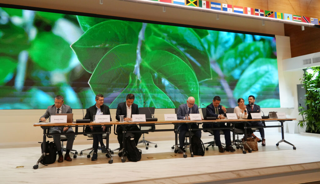 Joaquín Arias, coordinador del Observatorio de Políticas Públicas para los Sistemas Agroalimentarios del IICA; Jeimar Tapasco, Investigador de la Alianza Bioversity-CIAT; Héctor Peña, Economista Especializado en Políticas Agropecuarias del Banco Mundial; Pedro Martel, Jefe de la División de Agricultura y Desarrollo Rural del BID; Nelson Larrea, Ejecutivo Principal de CAF en Liderazgo en Sostenibilidad Agropecuaria; Valeria Piñeiro, Economista Senior del IFPRI; y Hugo Chavarría, Gerente del Programa de Innovación y Bioeconomía del IICA.
