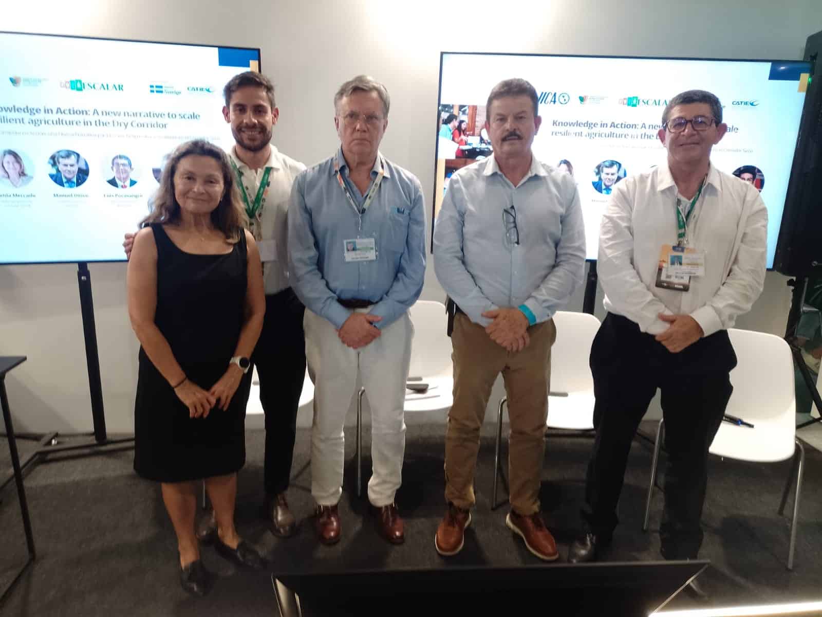 El Director General del CATIE, Luis Pocasangre; la conductora del proyecto Escalar, Leida Mercado; el subsecretario de Medio Ambiente del estado mexicano de Chiapas, Jorge Kanter; y el director de acción climática para Latinoamérica de la organización World Vision, Luis Corzo, compartieron un panel con el Director General del IICA, Manuel Otero, sobre desafíos y soluciones del Corredor Seco Centroamericano en la Casa de la Agricultura Sostenible de las Américas, en la COP30.